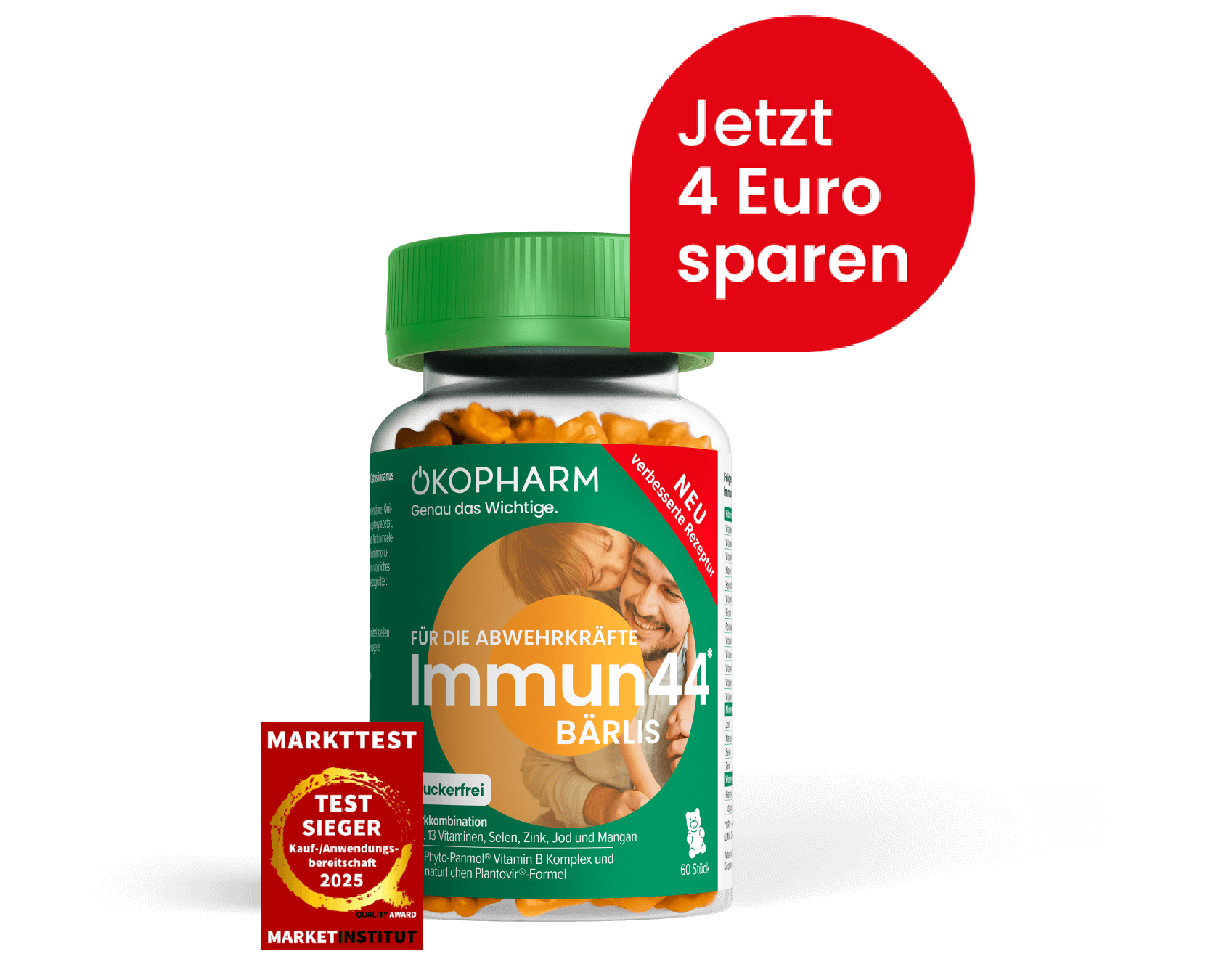 Durch die einzigartigen Kombinationen aus der Plantovir® Formel, einem wertvollen Pflanzenextrakt aus der Zistrose, dem Phyto-Panmol® Vitamin B Komplex aus hochwertigen Quinoa-Keimlingen und einer Vielzahl an Vitaminen und Mineralstoffen kann das Immunsystem deiner ganzen Familie bei einer generellen oder bei einer besonderen immunologischen Belastung mit den ÖKOPHARM® Wirkkomplexen der Immun44® Wirkkombinationsprodukte unterstützt werden. Für Kinder ab 3 Jahren gibt es unseren beliebten Immun44® Saft oder unsere Immun44® Bärlis mit fruchtigem Orangengeschmack.