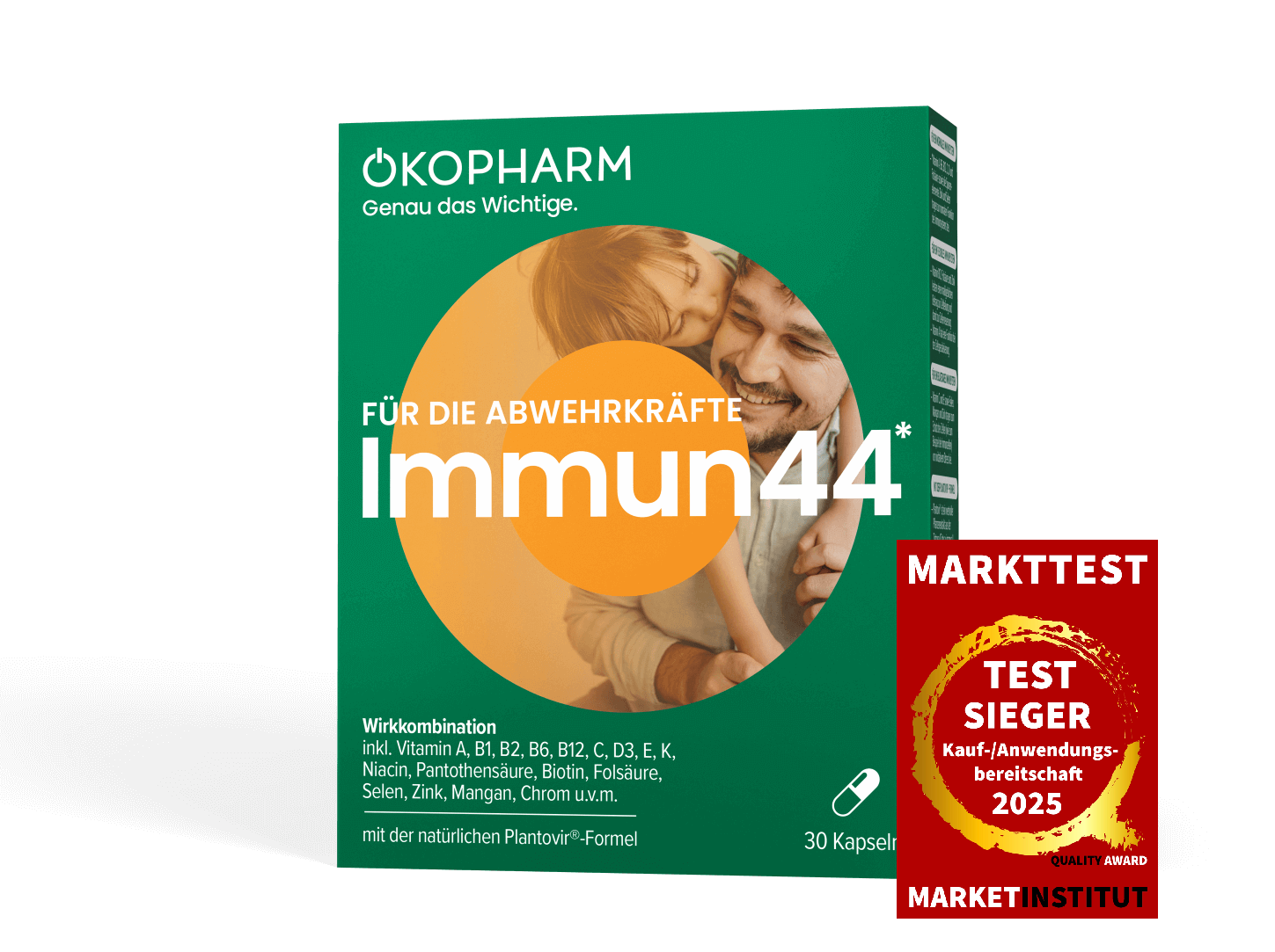 Die optimal abgestimmte Wirkkombination der Immun44® Kapseln von ÖKOPHARM® unterstützt mit ausgewählten Mikronährstoffen aktiv das Immunsystem.